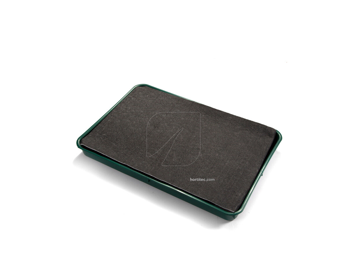 Bandeja con sistema de riego por capilaridad que mediante un tejido especial suministra agua a las bandejas y macetas que se encuentran en la parte superior: