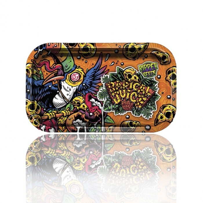Bandejas de metal con ilustradas con diseños de Ripper Seeds. La parte trasera es dorada, con el logo de la firma Ripper Seeds.
