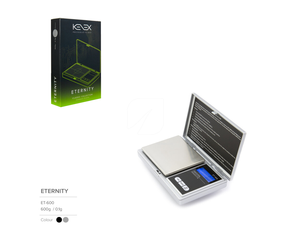 La báscula Eternity de Kenex, es uno de sus diseños más compactos que cuenta con la precisión y calidad que esta marca siempre ofrece. Eternity tiene una tapa incorporada, con cierre que se abre a través de un botón, para que la báscula se mantenga protegida siempre que no la estemos usando. Cuenta con protección de sobrecarga para que no se descalibre si ponemos sobre ella un peso superior al que puede leer. Disponible en dos versiones, Eternity te ofrece precisión de pesado a través de una placa de acero inoxidable, vista de los resultados en una pantalla LCD y en diversas unidades de medida.