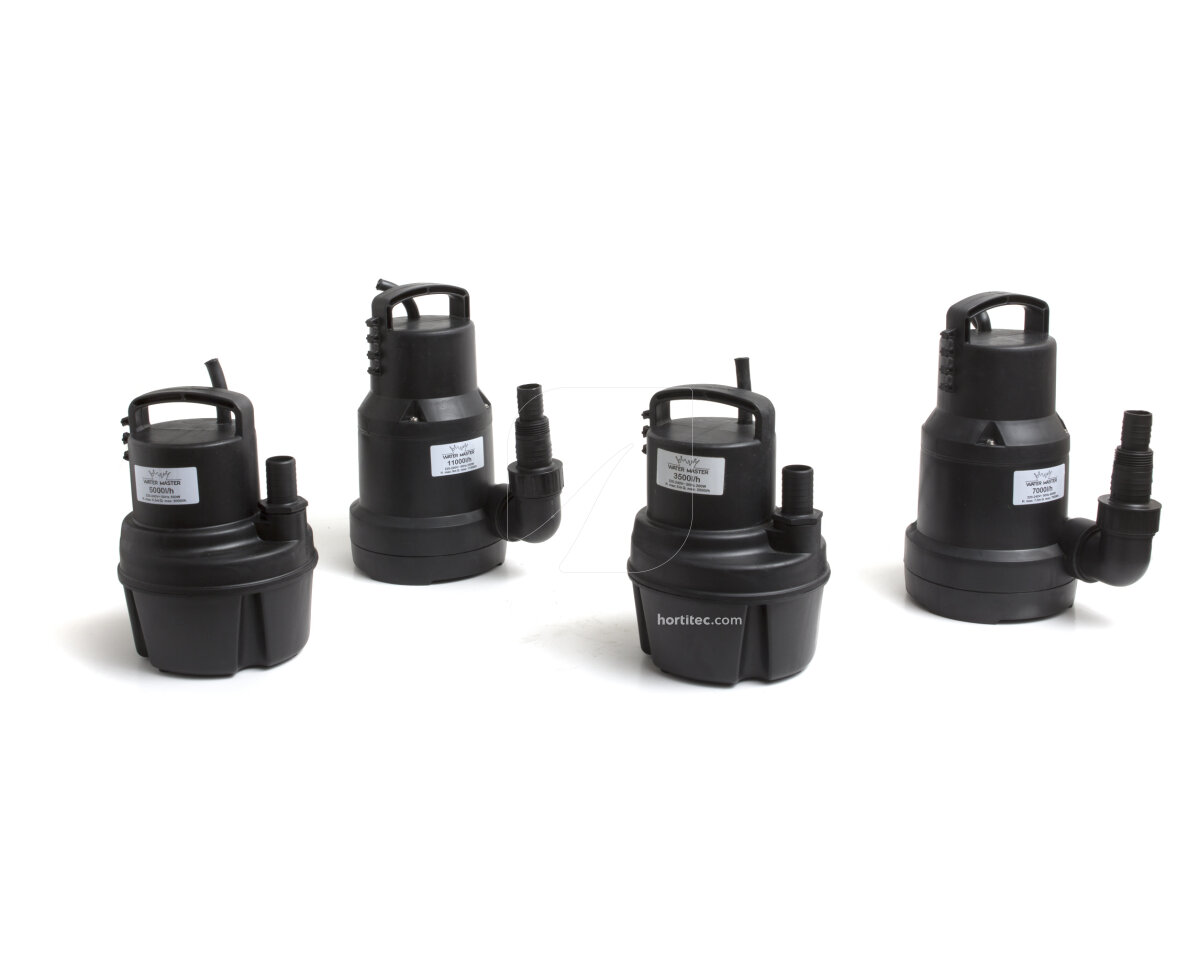 Las bombas sumergibles Water Master gran caudal están disponibles en caudales de 3500, 5000, 7000 y 11000 litros por hora. El consumo de estas bombas es de 200, 350, 400 y 550 w respectivamente.