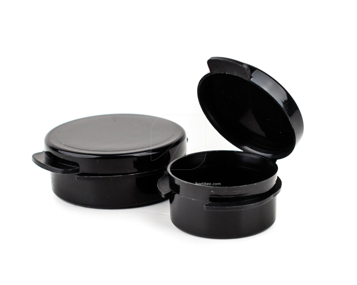 Botes de plástico económicos para conservación de resinas. Los botes de 10 ml son de 1,5 cm de alto por 3,5 cm de diámetro y los de 5 ml son de 1,5 cm de alto por 2,5 cm de diámetro.