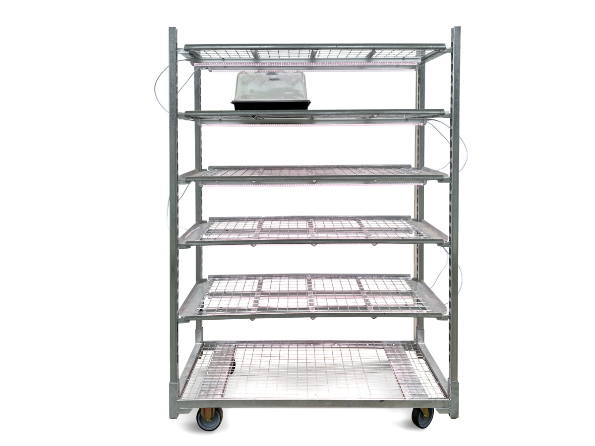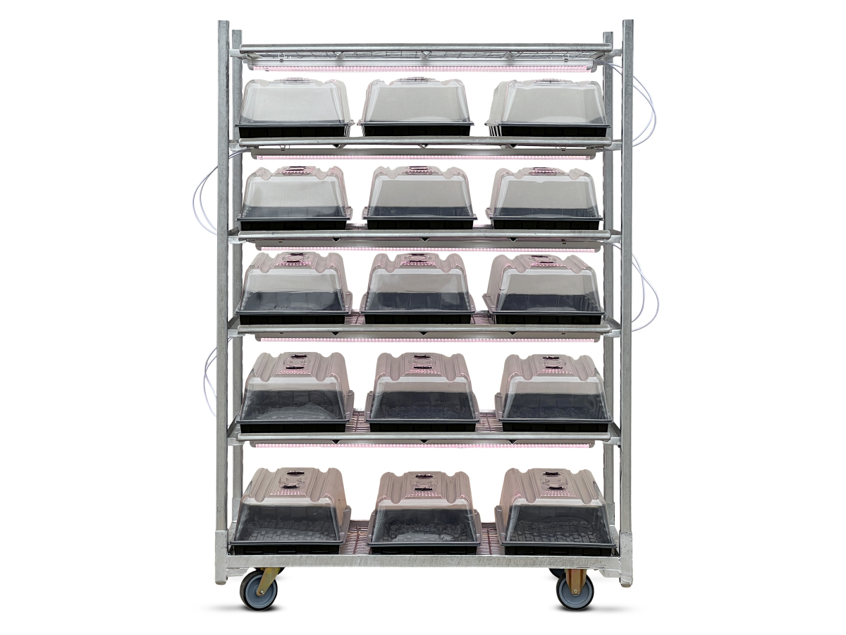 Carro completo de propagación de clones/semillero con sistema LED integrado. Cuenta con 5 bandejas que pueden albergar hasta 15 propagadores en los que se pueden cultivar 2250 semillas/esquejes (dependiendo del tipo de bandeja). Su recubrimiento de zinc galvanizado lo hacen apto para uso alimentario.