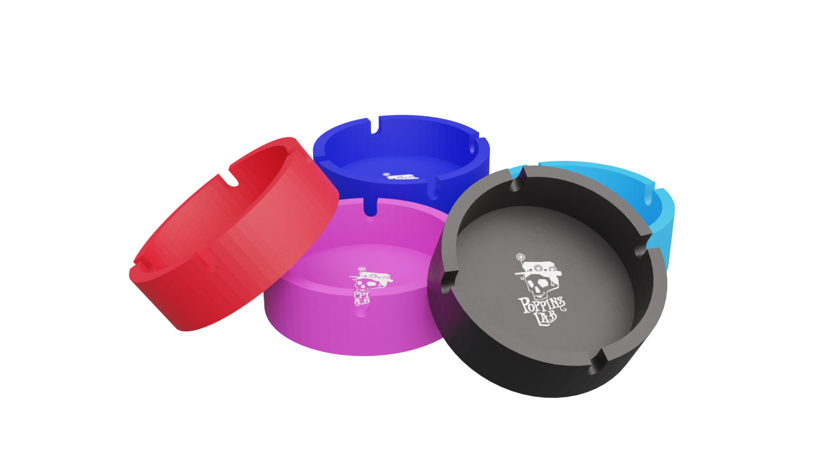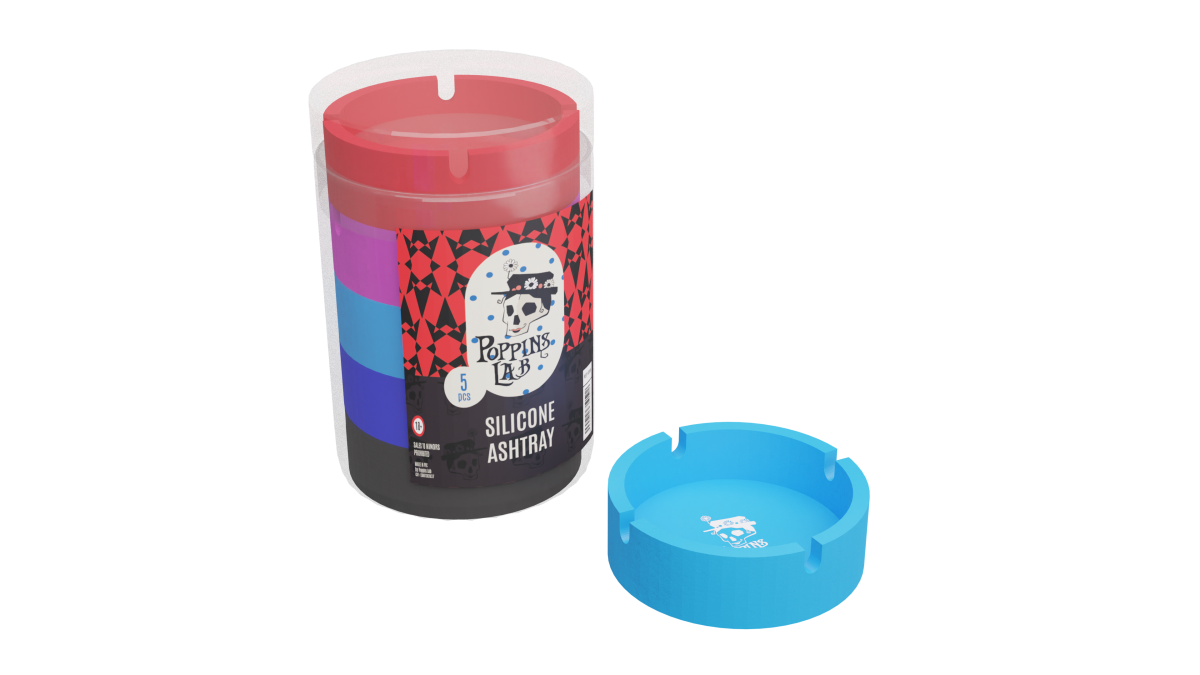 Este expositor incluye 5 ceniceros de silicona de la marca Poppins Lab, presentados en cinco colores distintos: negro, azul, rosa, morado y rojo (1 unidad por color).