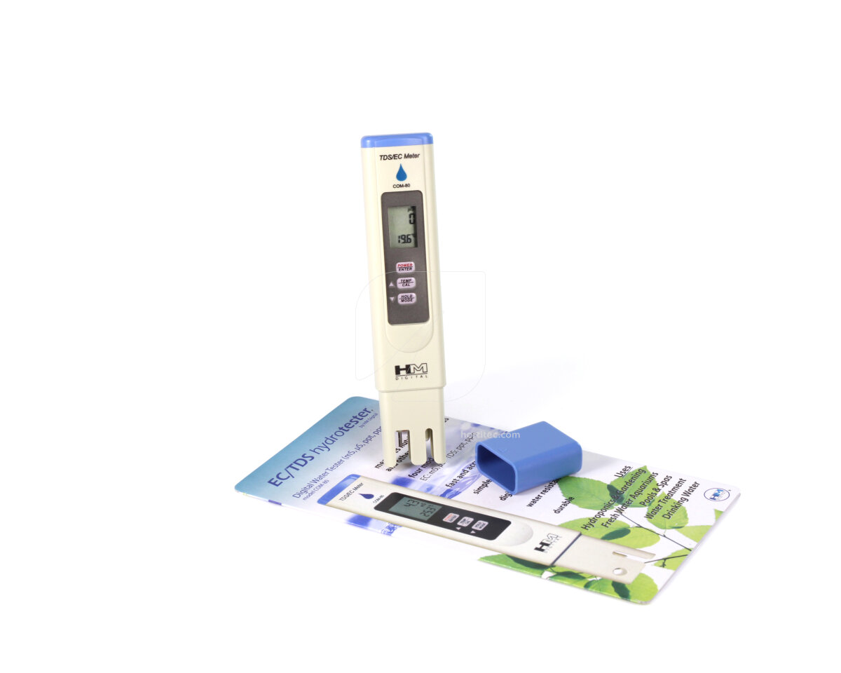 El conductivímetro COM-80 es un medidor de EC y temperatura, muy económico para uso en diversas aplicaciones como hidroponía y jardinería, piscinas y spas, acuarios, etc.