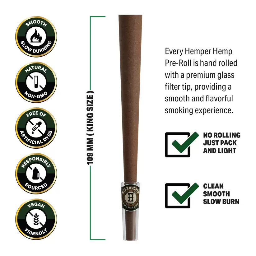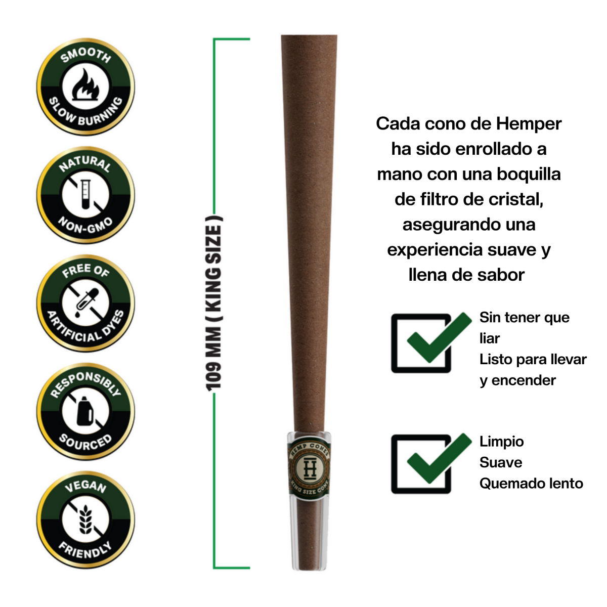 Los Hemper King Size Cones con punta de cristal son conos prearmados de papel de cáñamo natural, diseñados para ofrecer una experiencia de uso cómoda, limpia y práctica. Cada cono incorpora una boquilla de cristal reutilizable, que mejora la filtración y el flujo de aire, proporcionando una sensación más suave y controlada durante su uso.