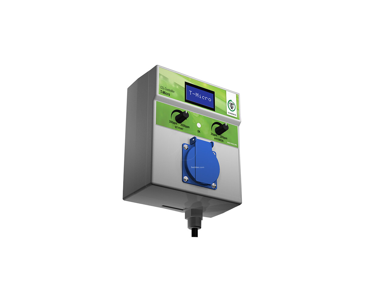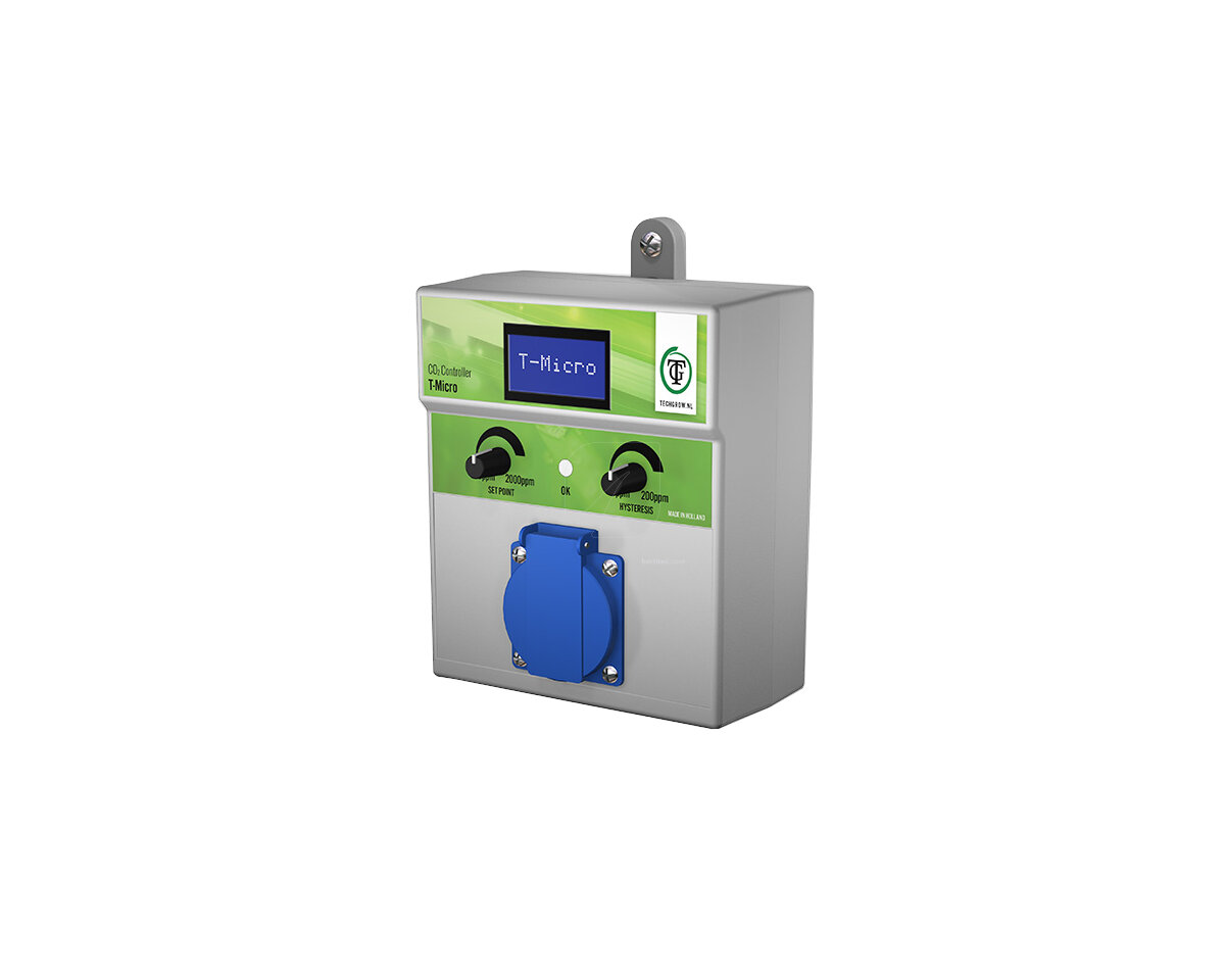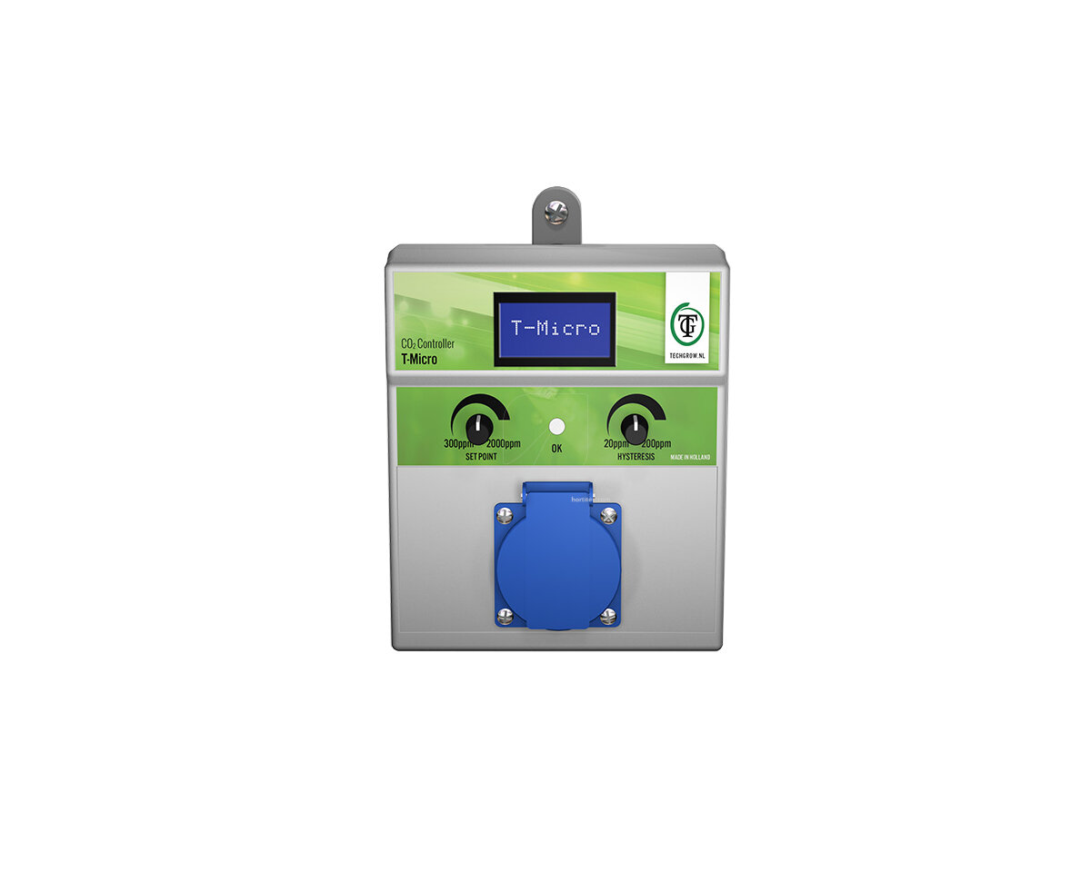 El controlador de CO₂ T-Micro de TechGrow es un dispositivo controlado de forma digital que mide y regula los valores de CO₂ de una sala de cultivo. Cambia los ajustes de día y noche automáticamente gracias a un sensor externo de CO₂ con sensor de luz (no incluido).