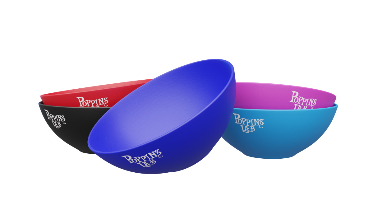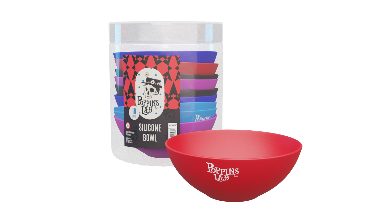 Este expositor incluye 10 cuencos de silicona de la marca Poppins Lab, con dos unidades por color: azul claro, negro, rojo, rosa y azul oscuro.