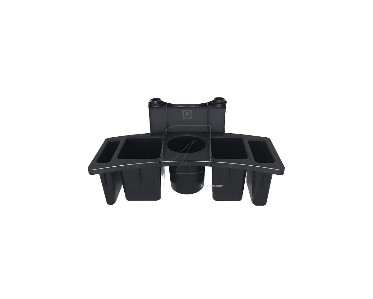 Tool box to fit 10 gallon (38.85 liter) pots. It has 5 modules, a round one in the center, two square ones on the sides and two rectangular ones on the sides. It is black.