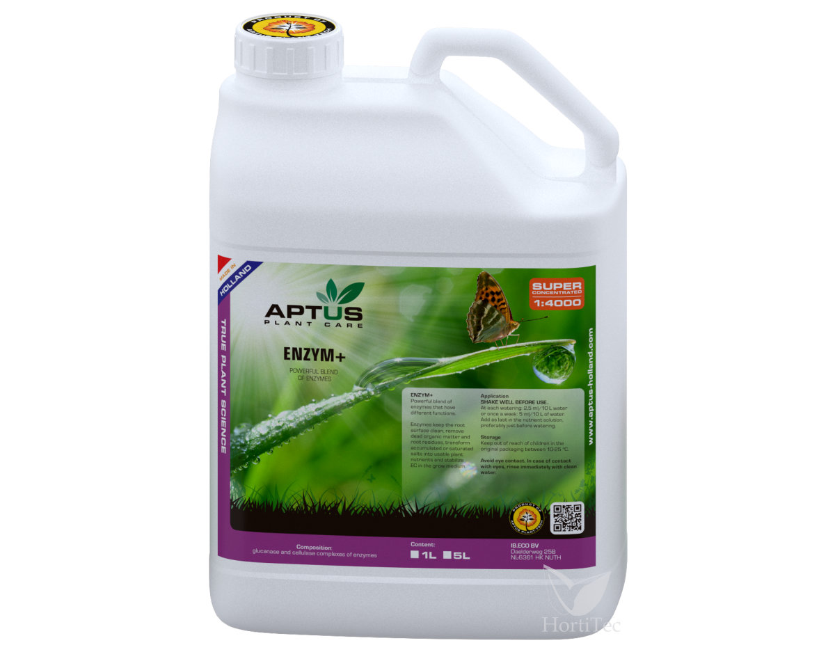 Enzym+ es una mezcla potente de complejos de enzimas. Enzym+ contiene distintas clases de enzimas que tienen diferentes funciones. Enzym+ mantiene limpia la superficie de la raíz, por lo que la planta absorbe mejor los nutrientes. Enzym+ elimina la materia orgánica muerta y los residuos de raíces. Enzym+ transforma las sales nutrientes acumuladas y saturadas en nutrientes disponibles para la planta y estabiliza el EC en el medio.