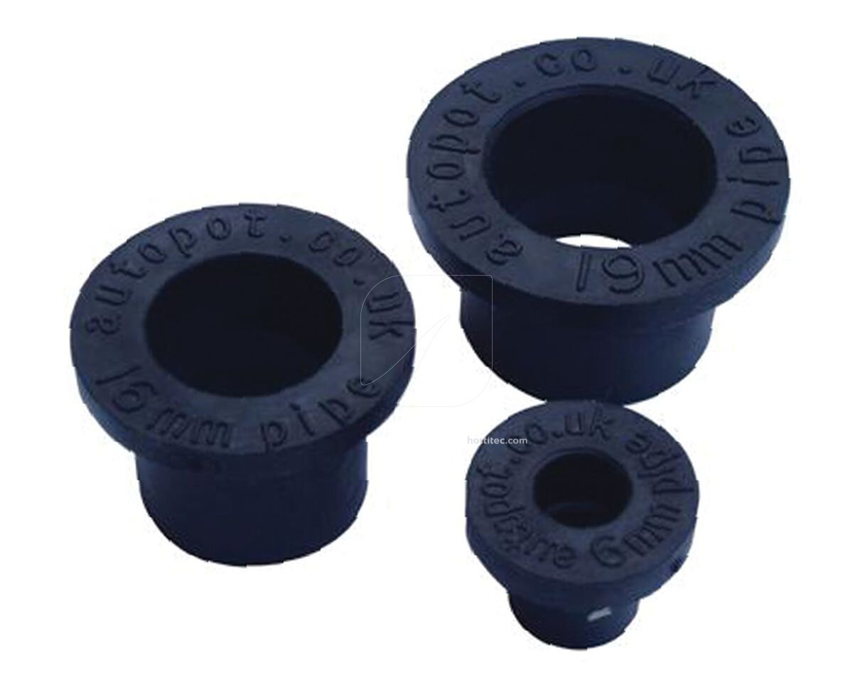 Las arandelas aislantes aros de goma permiten una conexión hermética entre la manguera y el tanque de AutoPot. Inserta la arandela aislante en el orificio y conecta la manguera al mismo, hasta que el extremo quede en el interior del tanque.