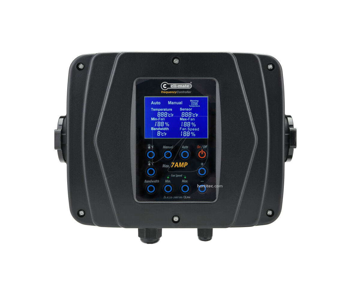 Fan controller para control de la temperatura. Totalmente digital y con pantalla LCD que muestra los valores y los campos a configurar. Cuenta con dos modalidades de uso, auto y manual. Funciona con un transformador de frecuencia, por lo que ahorra energía y es silencioso. Ajuste continuo y preciso, fija la velocidad Hercio a Hercio. Incluye sensor de temperatura.