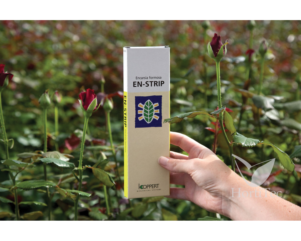 En-strip 3000(Encarsia formosa),es una avispa parásita que pone un huevo en la larva de la mosca blanca, emergiendo posteriormente una nueva avispa parásita.
