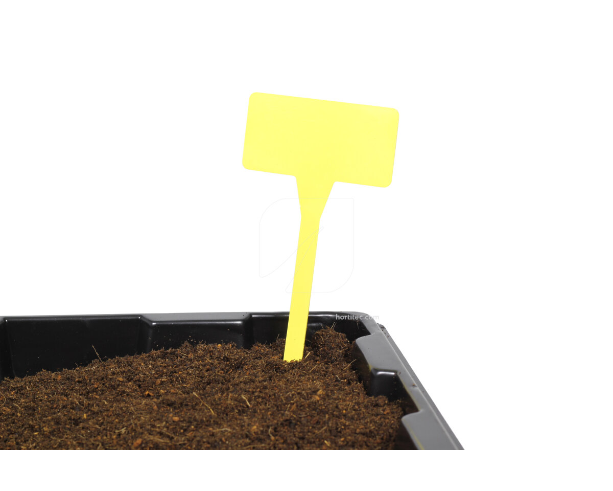 Etiquetas de plástico de color amarillo con una superficie para la escritura. Se usan para identificar macetas y bandejas. Se presentan en bolsas de 100 unidades.