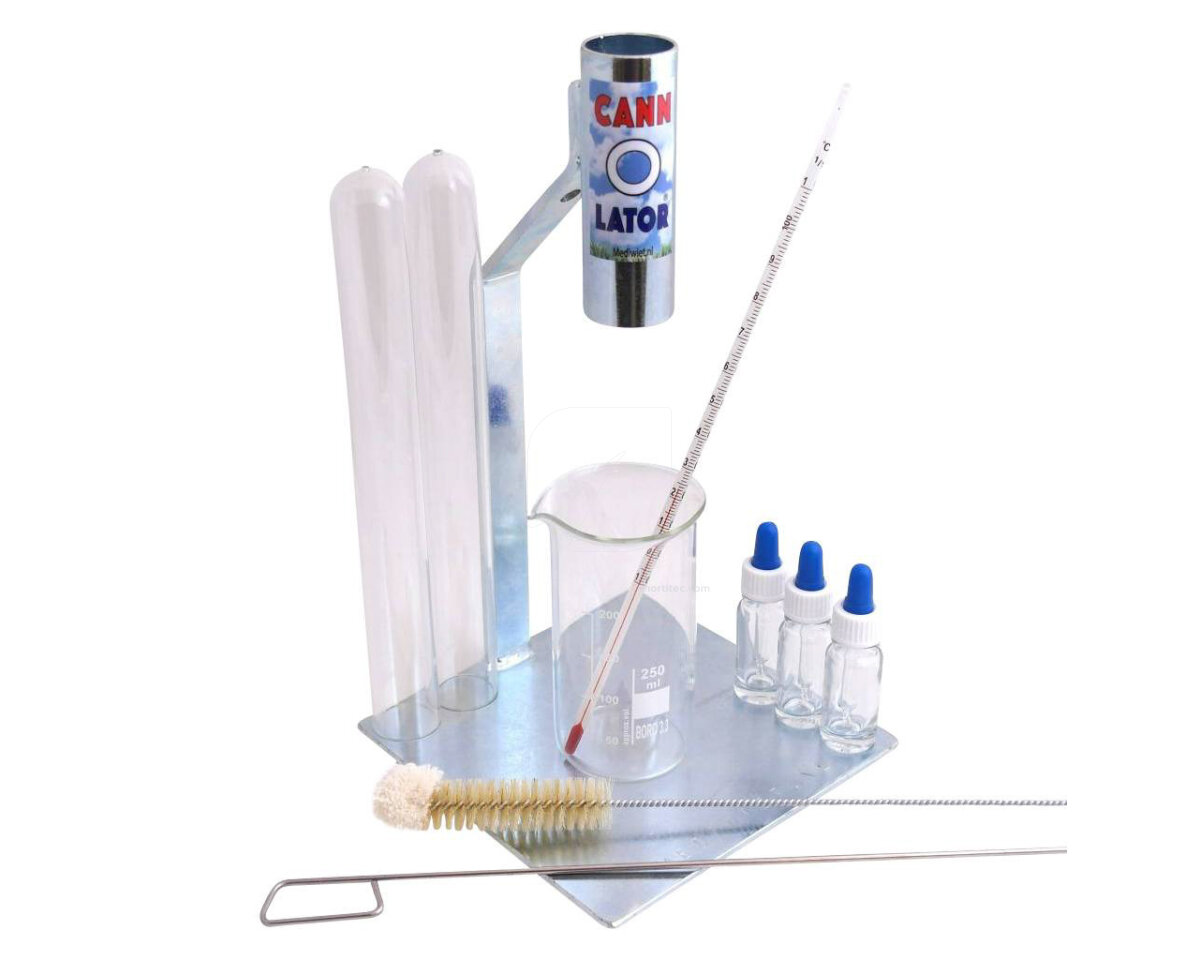 Incluye: 1 cannolator, 2 tubos de vidrio, 1 taza de medir (250ml), 3 botellas de pipeta (10ml), 1 cepillo de limpieza extra largo, 1 pluma de limpieza, 1 termómetro y carpeta con instrucciones