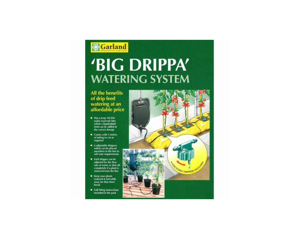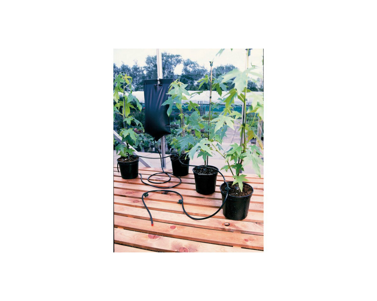 Kit de riego económico que funciona sin electricidad. El sistema cuenta con un depósito de 10,5 litros en forma de bolsa muy resistente, 5 metros de tubo de riego y 6 goteros ajustables.