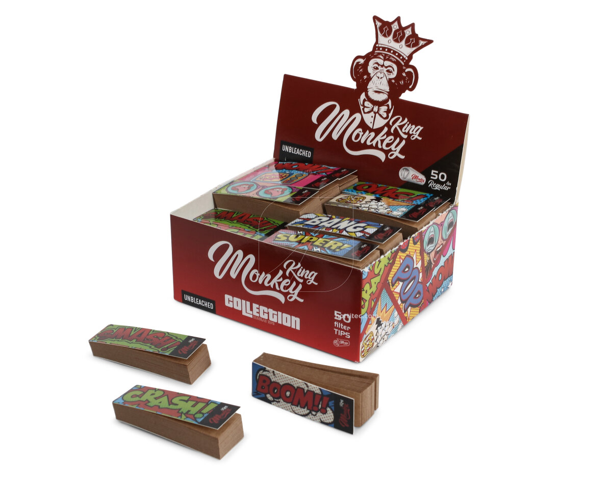 La caja incluye 50 libritos con 50 filtros cada unidad, fabricados con papel sin blanquear. Cada librito tiene un diseño diferente, con los dibujos de Monkey King.