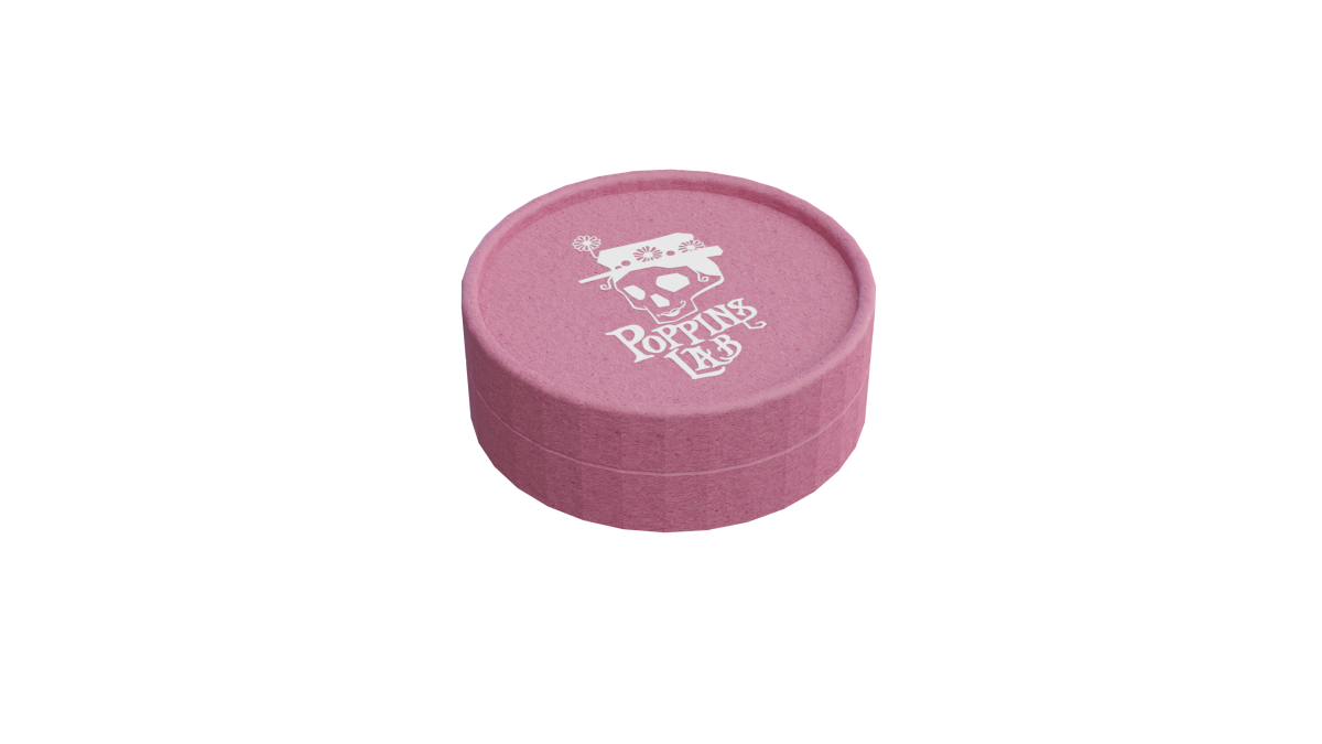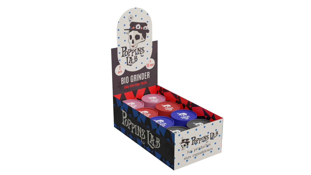 Display de 24 grinders fabricados con plástico reciclado, de la marca Poppins Lab. Cada unidad mide 55 mm de diámetro y 25 mm de altura.