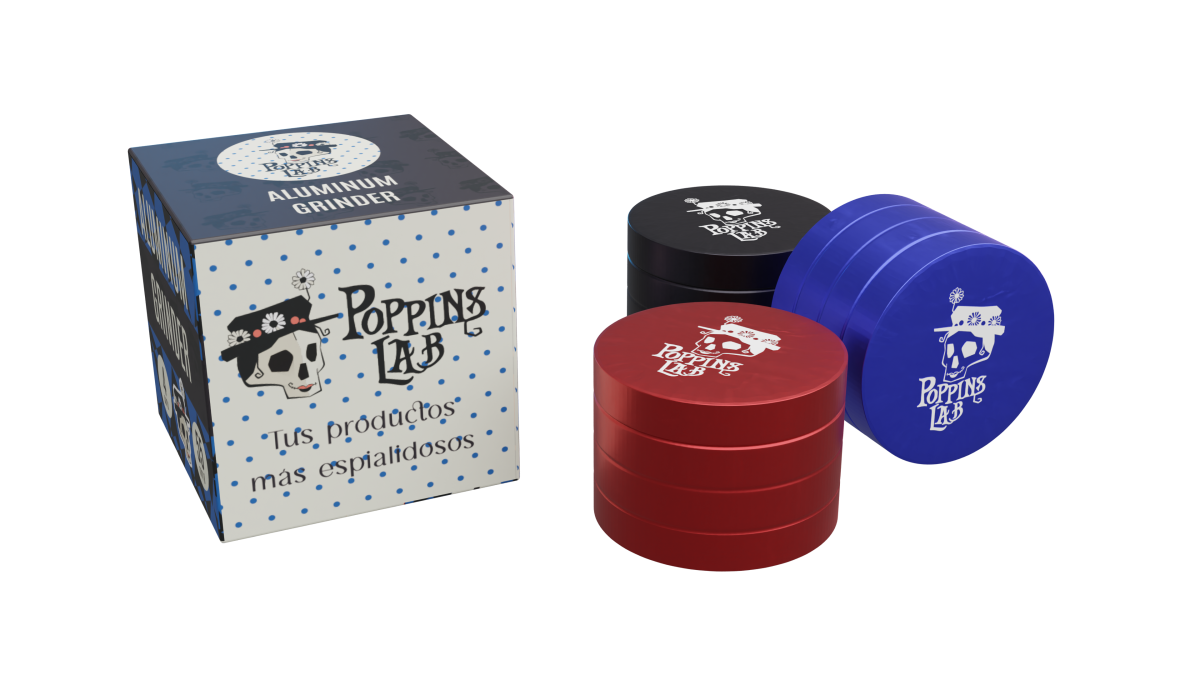 Grinder de aluminio de alta calidad con un diámetro de 55 mm y una altura de 40 mm. Compuesto por 4 partes: zona de molienda, filtro intermedio para separar por tamaño y un segundo filtro para polen fino. Resistente, funcional y fácil de desmontar para su limpieza.