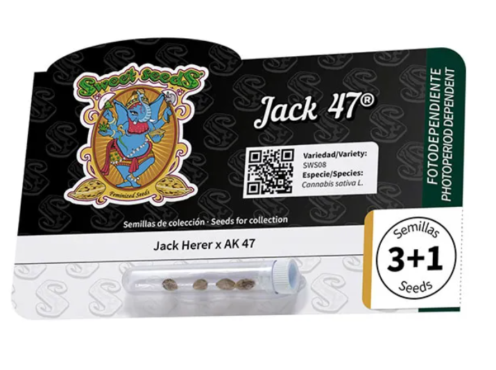 Jack 47® es una variedad fotodependiente de alto rendimiento que destaca por su vigor, producción y perfil aromático complejo. Se trata de un híbrido muy equilibrado que combina potencia, estabilidad y una gran capacidad productiva.