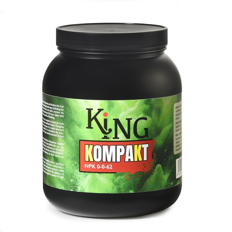 KING KOMPAKT contiene ácidos húmicos, azucares y azufre, que favorecen la absorción del fósforo y otros micro nutrientes, aumentando la calidad y maduración de la cosecha y promoviendo una explosión de resina.