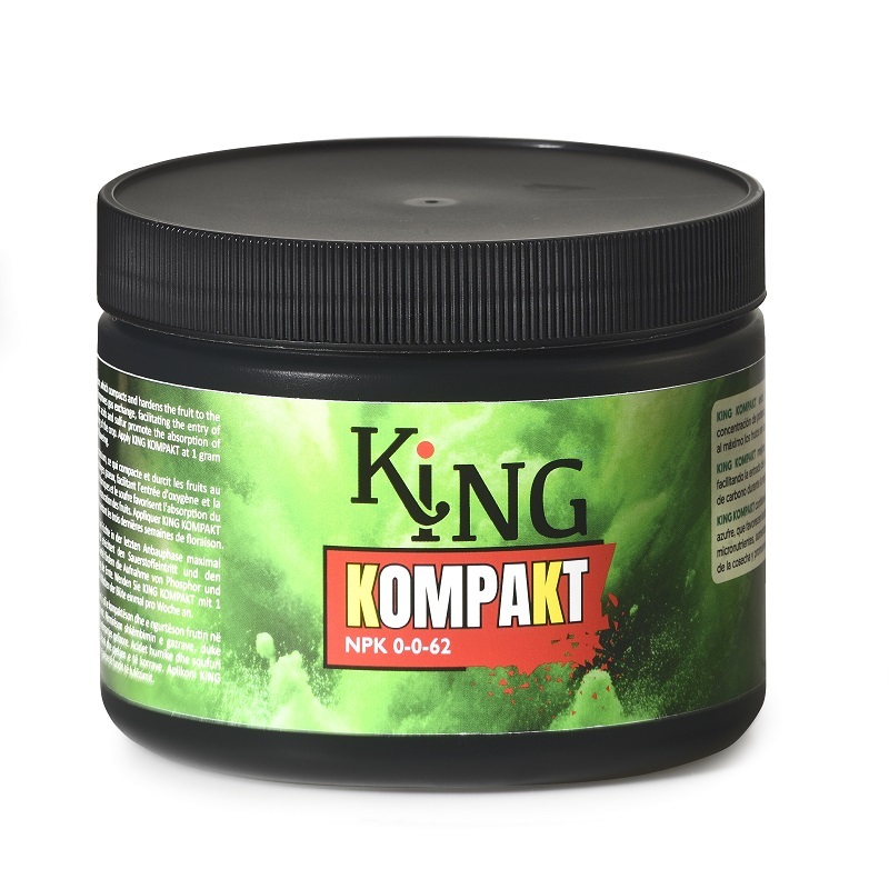 KING KOMPAKT contiene ácidos húmicos, azucares y azufre, que favorecen la absorción del fósforo y otros micro nutrientes, aumentando la calidad y maduración de la cosecha y promoviendo una explosión de resina.