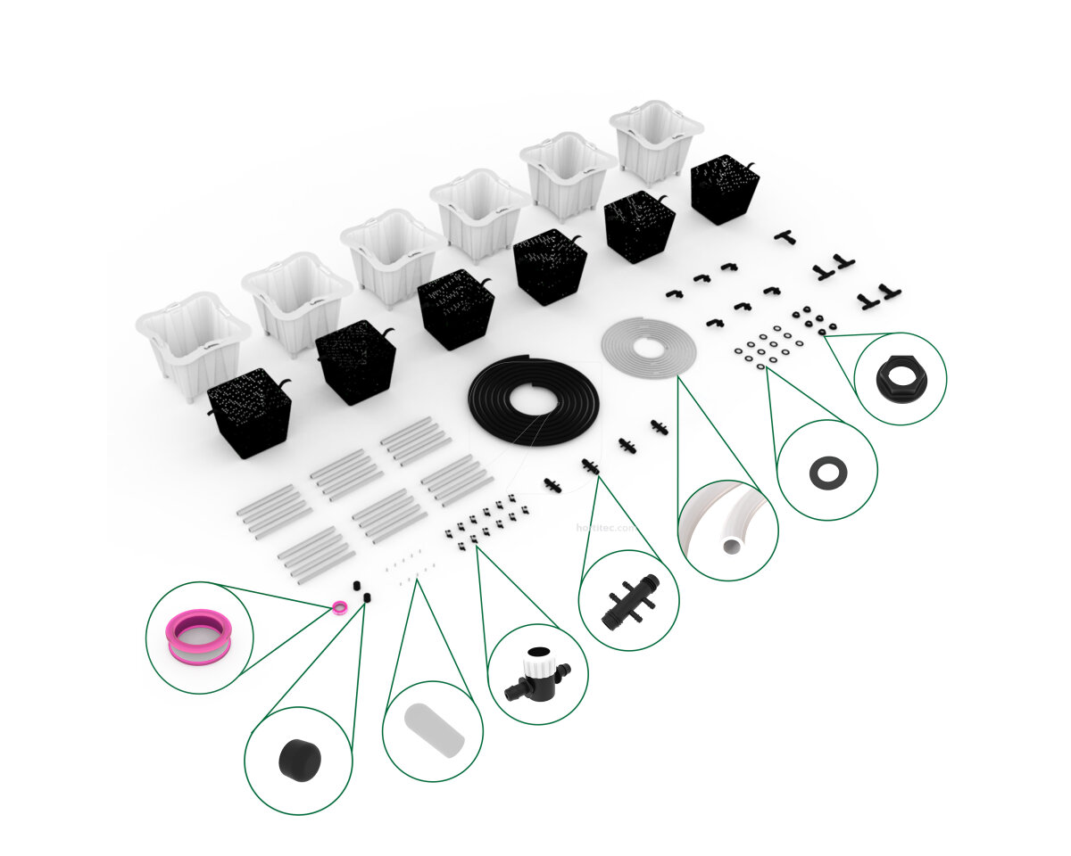 Los kits cuentan con todos los accesorios, empalmes y conectores necesarios para un completo sistema de cultivo. Son fáciles de usar y montar gracias a sus conexiones, sin necesidad de usar herramientas.