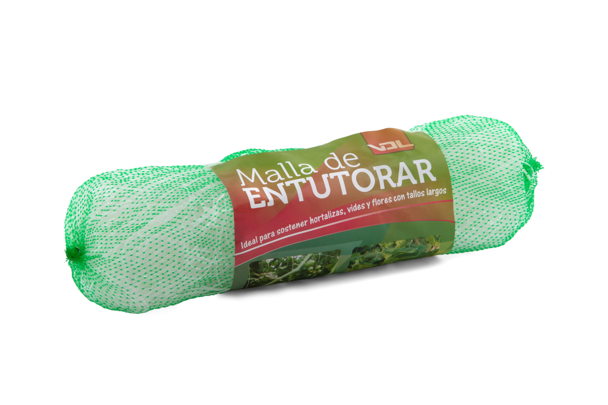 Malla de cuadros blanca hecha de plástico, diseñada específicamente para cultivos hortícolas verticales, facilitando el soporte de plantas trepadoras como pepinos, judías, tomates, entre otros.