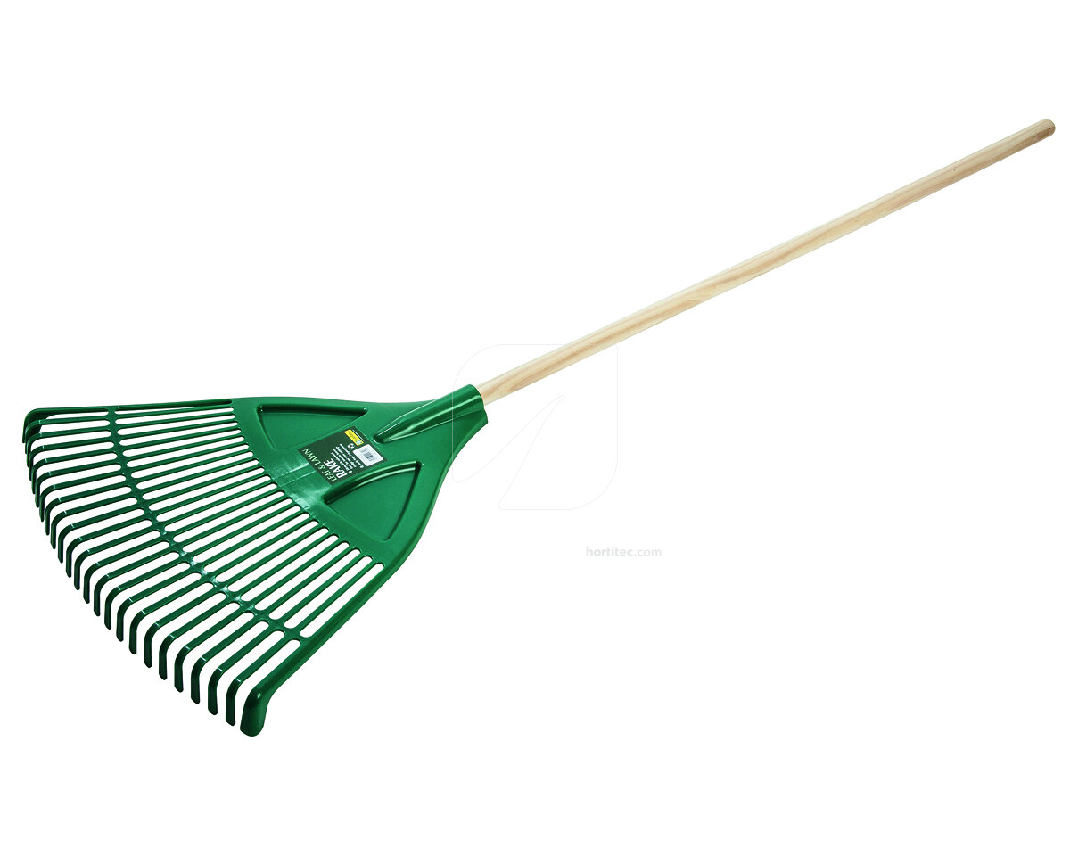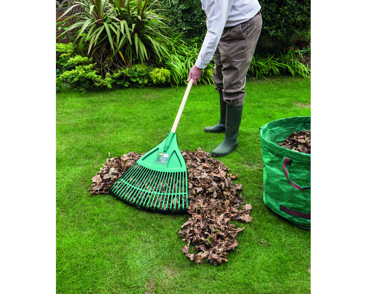 Moldeado en polipropileno 100% reciclado de excepcional fuerza, este resistente rastrillo con mango de madera es ideal para arrastrar hojas y césped.