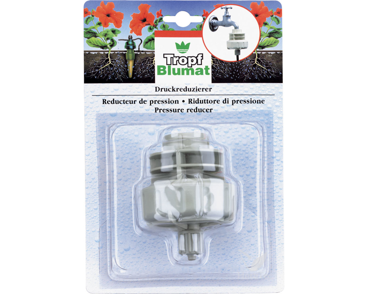 El reductor de presión se ajusta permanentemente a 1 bar (para la presión de las tuberías de agua normales), incluye una conexión para la tubería de suministro de agua de 8 mm. El reductor de presión Blumat permite el riego de plantas situadas a una altura máxima de 4 metros, sin necesidad de instalar un depósito de suministro.