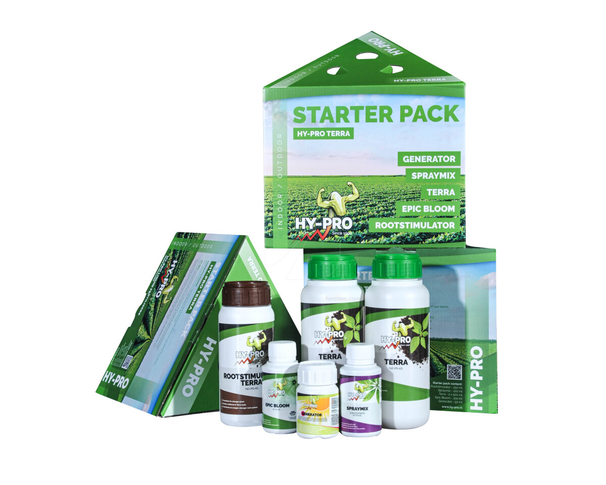 El Starter Pack Terra de Hy Pro Contiene los nutrientes líquidos que necesitas. Este kit es apto para plantas en interior y exterior, tanto en maceta como en suelo. Está formado por: