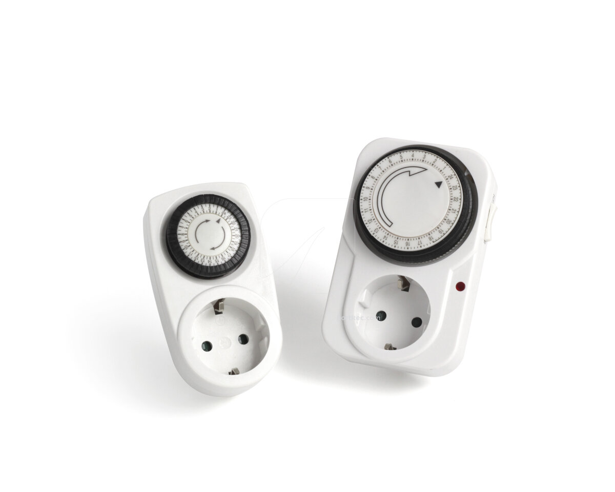 Reloj temporizador básico para activar/desactivar accesorios eléctricos como equipos de iluminación, ventiladores, bombas, etc. La potencia máxima de conexión es de 1800 W y la maniobra mínima de funcionamiento es de 15 minutos que se activa mediante pestañas extraíbles e interruptor.