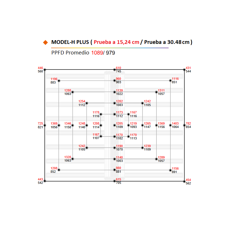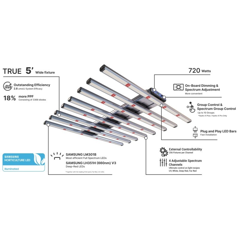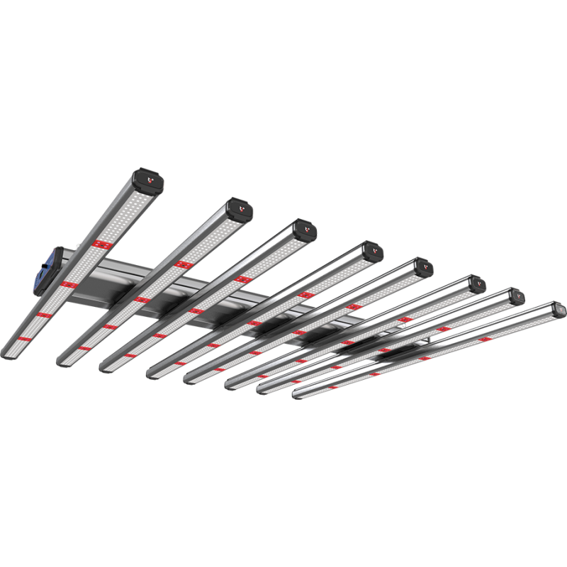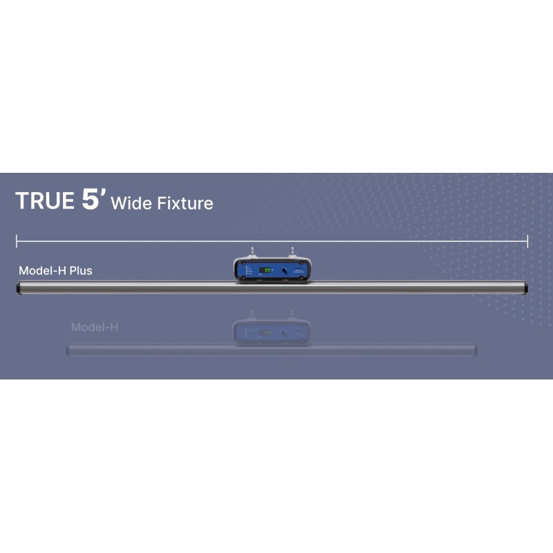 El Modelo-H Plus es una luminaria para cultivos de alta intensidad lumínica. Con 3368 chip SMD de alta eficiencia (Samsung LM301B/LH351H) para un total 720w, resultando en un aumento del PPF 18% con respecto al modelo H. Podrás controlar la intensidad lumínica directamente en el cuerpo de la luminaria o controlar individualmente cada espectro (UV, Blanco, Rojo profundo y Rojo lejano) para crear tus propias recetas ajustada a tus plantas en cada etapa.