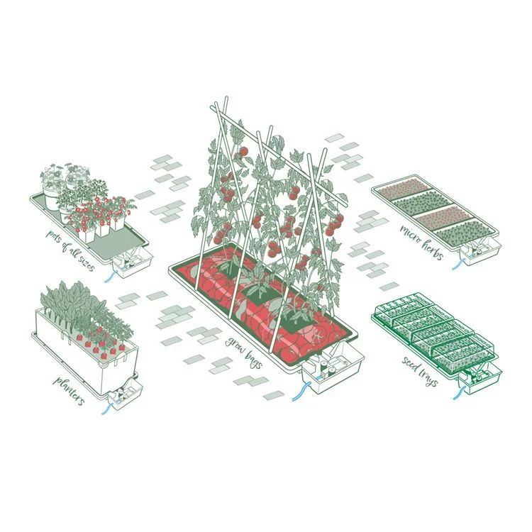 Tray2Grow é um sistema totalmente automatizado e sem energia que oferece cinco maneiras diferentes de alimentar e regar suas plantas, incluindo bandejas de sementes, vasos pequenos, sacos de cultivo, micro ervas e plantadores. É o produto mais versátil da linha AutoPot e um dos sistemas de irrigação mais flexíveis disponíveis.